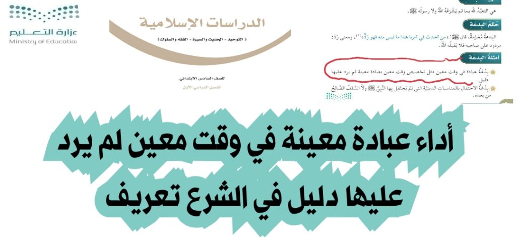 إلى زملائي الطلاب، والطالبات في مدارس المملكة العربية السعودية، من خلال هذا المقال سنقدم لكم إجابة سؤال: أداء عبادة معينة في وقت معين لم يرد عليها دليل في الشرع تعريف… كان هذا السؤال موجه لطلبة الصف السادس الابتدائي الفصل الدراسي الأول، وهو من ضمن أسئلة مادة الدراسات الإسلامية.