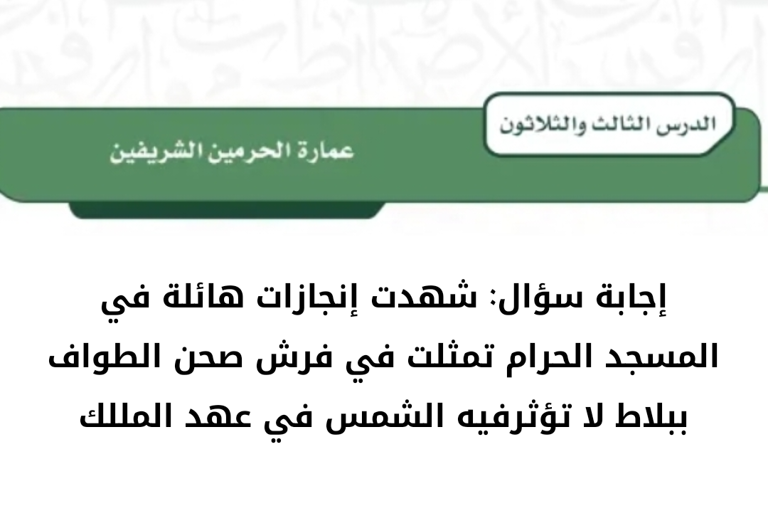 حل سؤال شهدت إنجازات هائلة في المسجد الحرام تمثلت في فرش صحن الطواف ببلاط لا تؤثرفيه الشمس في عهد المللك