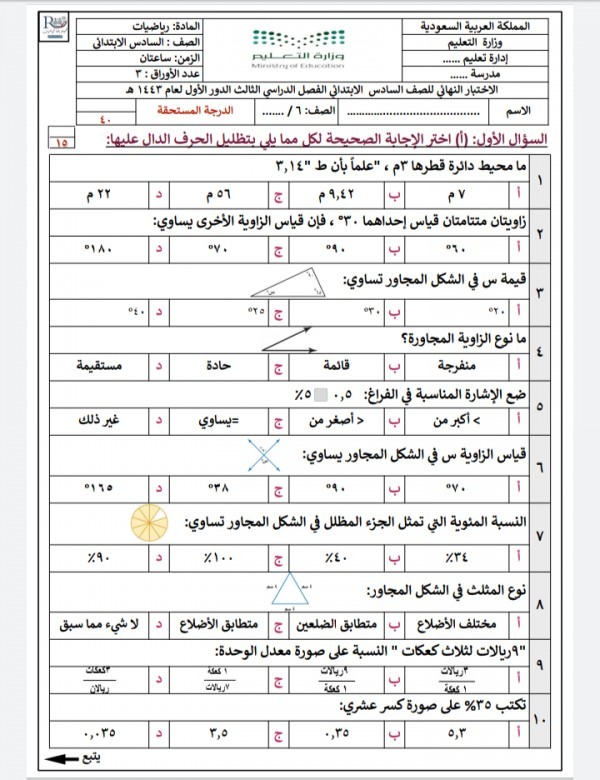 يشرفنا طلابنا الكرام في الصف السادس الابتدائي زوار موقع حروفوحلول ان نقدم لكم نموذج اختبار نهائي رياضيات الصف السادس الابتدائي ف٣ للعام الدراسي ١٤٤٣ كالتالي: