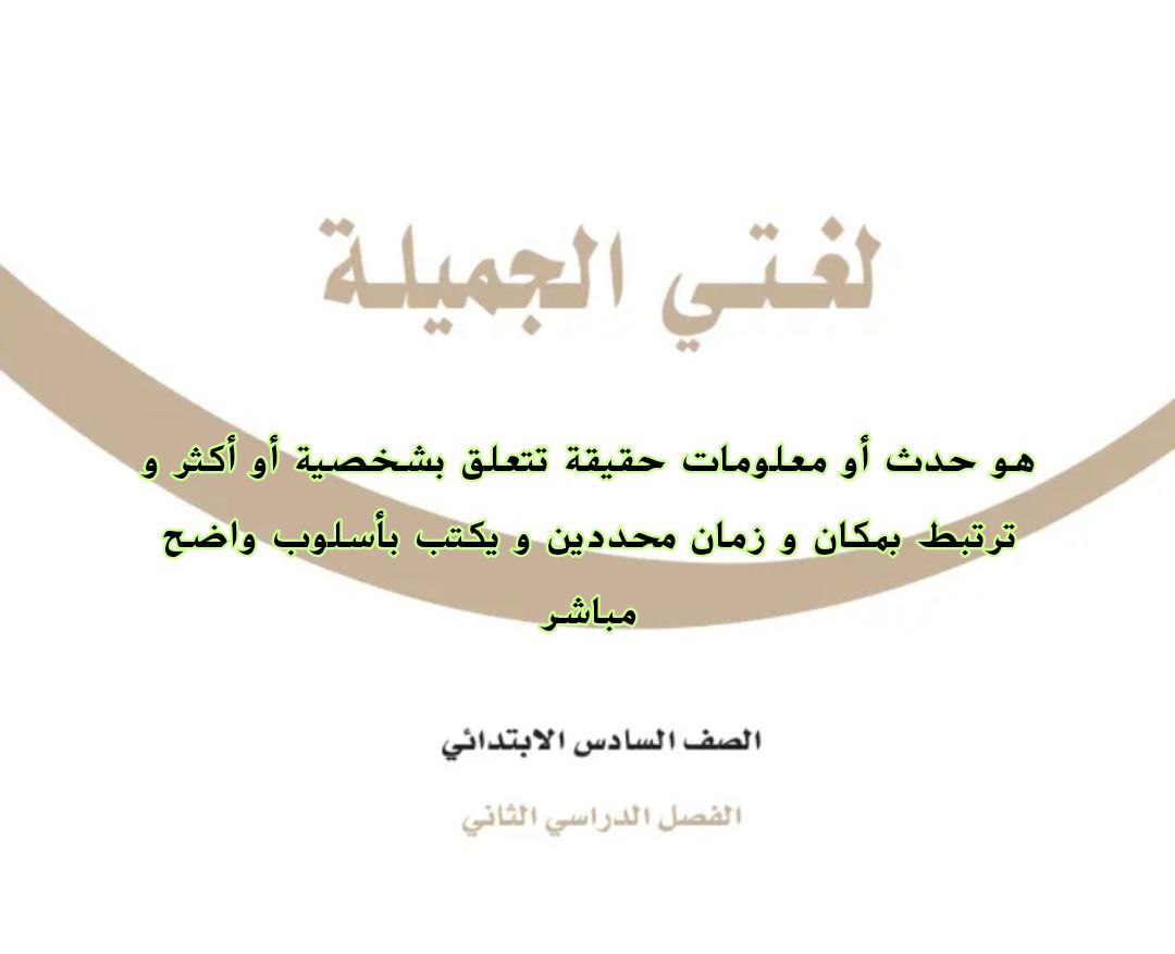 هو حدث أو معلومات حقيقة تتعلق بشخصية أو أكثر و ترتبط بمكان و زمان محددين و يكتب بأسلوب واضح مباشر