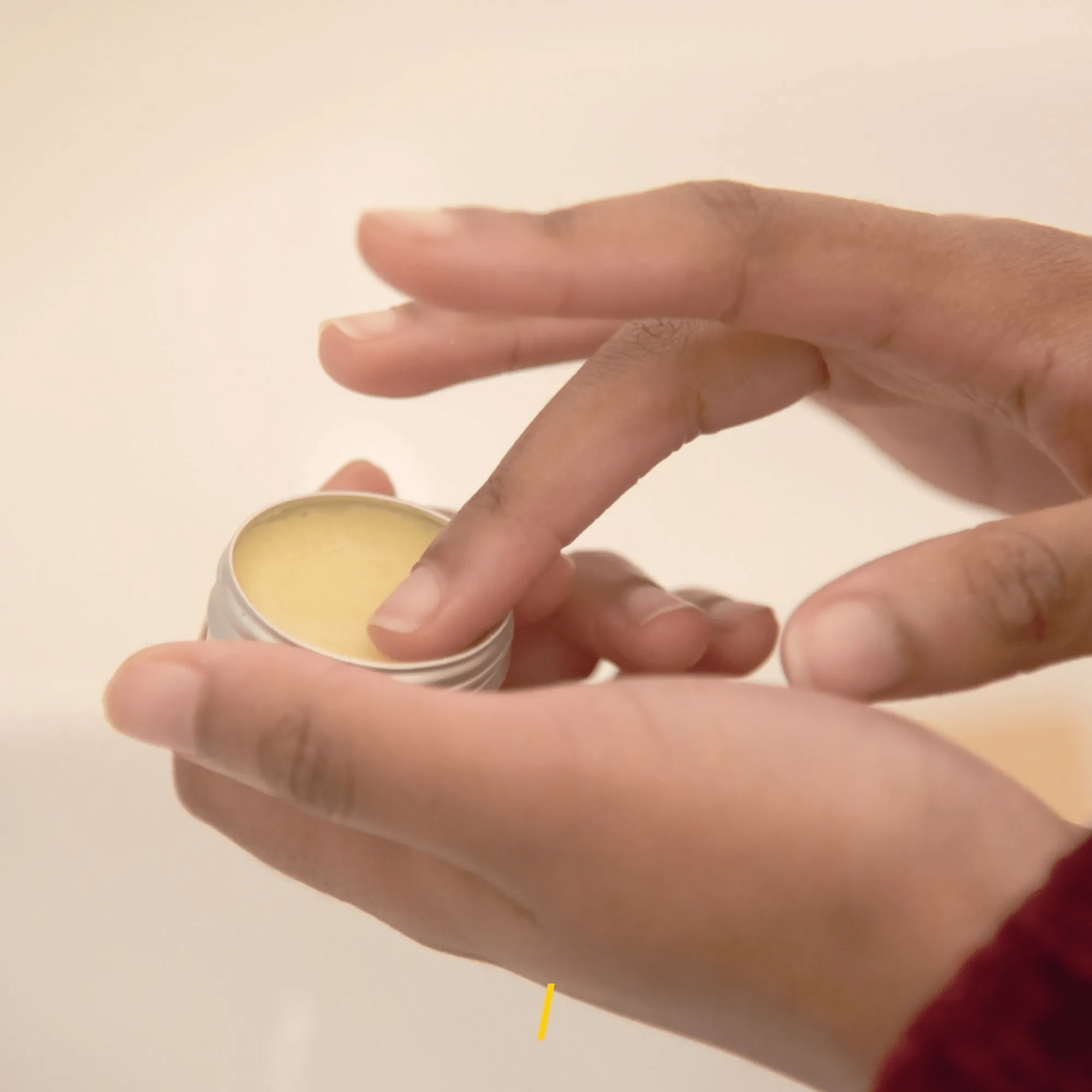 أذيبي زبدة الشيا وشمع العسل في حمام مائي ساخن ثم أضيفي 5 قطرات من مستخلص جوز الهند وقطرتين من فيتامين هـ.